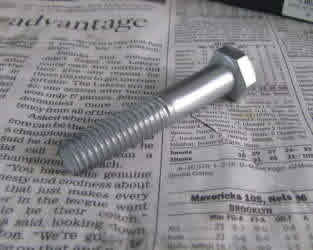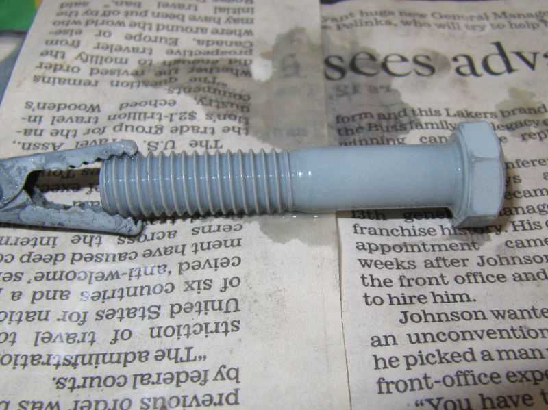 Zinc plating requires a zinc anode. Plating shops use expensive, high-purity metal anodes. For reasons of cost and availability, I use a zinc anode intended for protecting metal boats from corrosion. Such anodes are readily available, relatively pure, and cheap. More importantly, the nature of their use guarantees low lead content; lead contamination of the bath can reduce plating quality. Such anodes may contain a few tenths of a percent cadmium or aluminum, added intentionally to enhance their anticorrosion performance. The amount of the intentional and any unintentional impurities is usually well below 1%. I use only one anode, then turn the part around halfway through the plating period. Multiple anodes are sometimes used to produce a more uniform coating without turning.