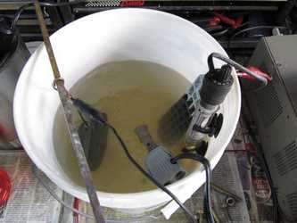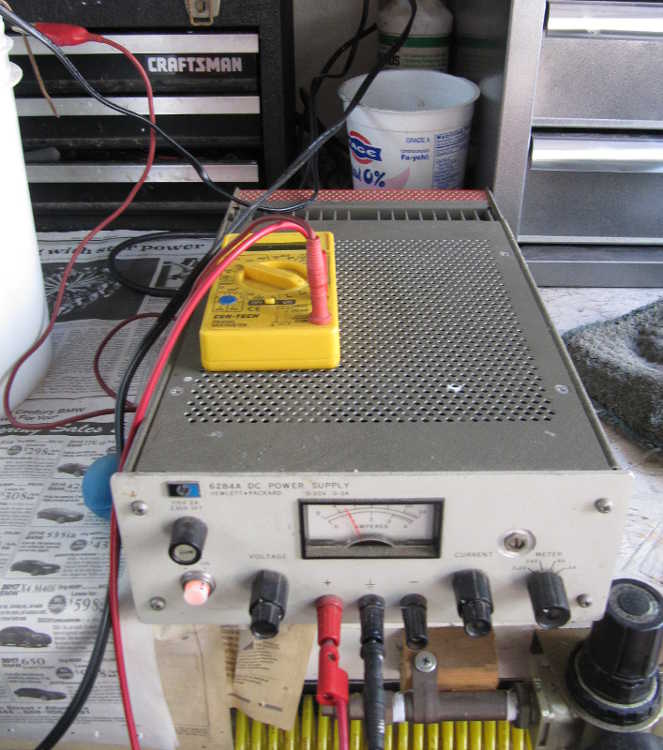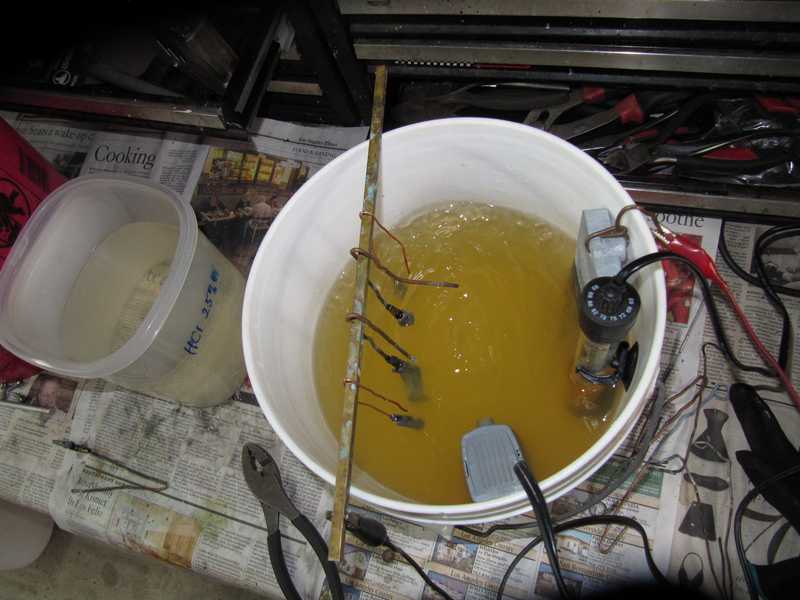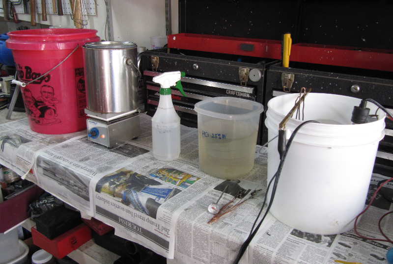 The pictures below show my setup. Since the pics were taken, I bought a new power supply, and the detergent solution, in the paint can in the picture, is now in an old slow cooker ($5 at the local thrift store).